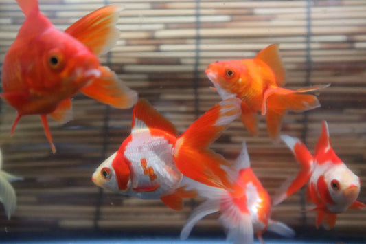 和金よりも丸い体型をしており尾が長いため、ゆらゆらと優雅に泳ぐ点、体が丸いため大きくなり過ぎないことも飼育者が多い理由として挙げられます。ファミリーから長年金魚を飼育している愛好家まで、とにかく幅広い層に人気が高くポピュラーな品種です。強健な品種であり、飼育環境だけ整えられれば問題なく飼育できますが、あまりにも丸い個体や尾の付け根の位置が高い個体などは転覆症に注意する必要があります。成長する過程で尾びれをどれだけ美しく損なわないで成長させるかという点が琉金飼育の楽しみであり醍醐味でもあります。琉金はお腹が深く消化能力の低い品種になりますので、消化不良をおこしやすいので粒の小さいエサを複数回に分けて与えるのがいいです。また排泄物の量も多めで水を汚し易い面があるのでフンの分解を手伝ってくれるようなエサが好ましいです。また鮮やかな色合いが美しい金魚ですが、大きくなるにつれてその赤みが薄くなってきた場合は色揚げフードを併用してあげることにより、その美しさを保つことが可能です。
